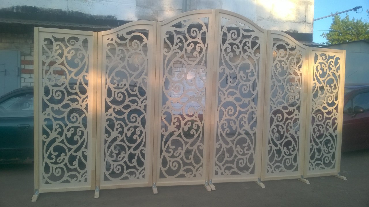 Интересным и нужным декором выездного мероприятия является ширма на свадьбу. Она может стать ещё и отличным фоном для фотосессий либо украсить место для молодожёнов. Задний фон с красивой резьбой – это эффектно, особенно в сочетании вместе с красивыми бантами, лентами либо декорированием из цветов.