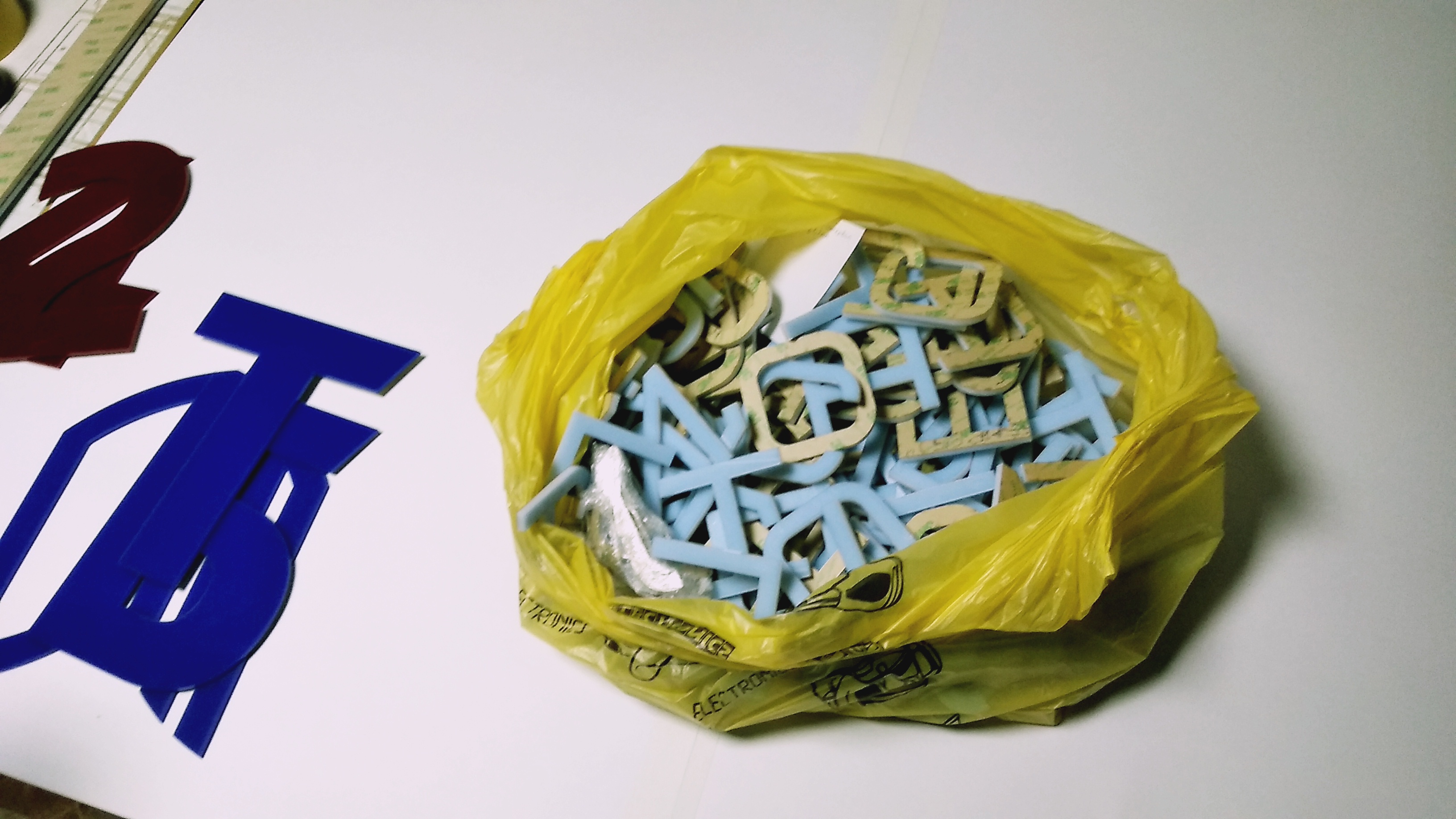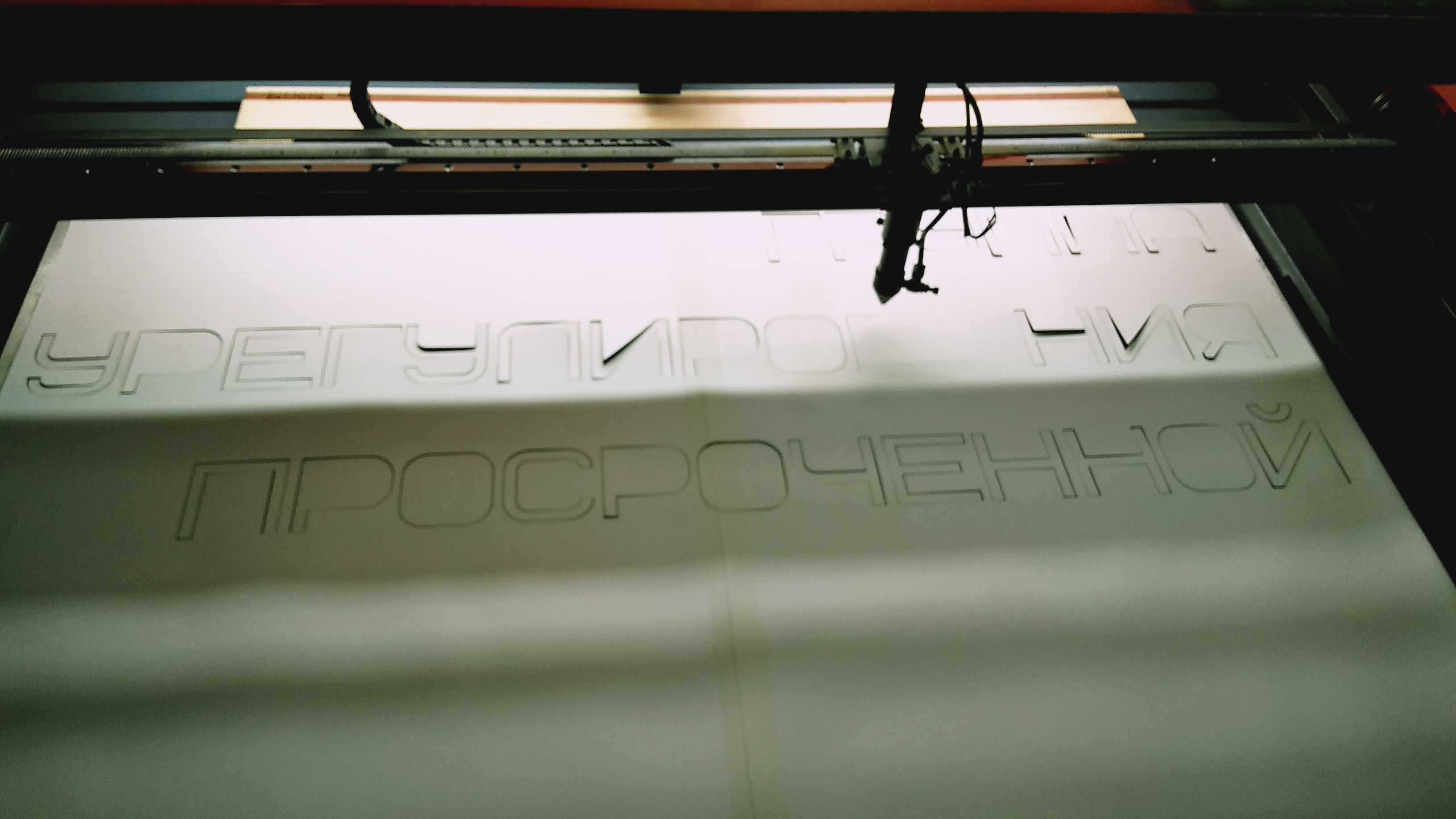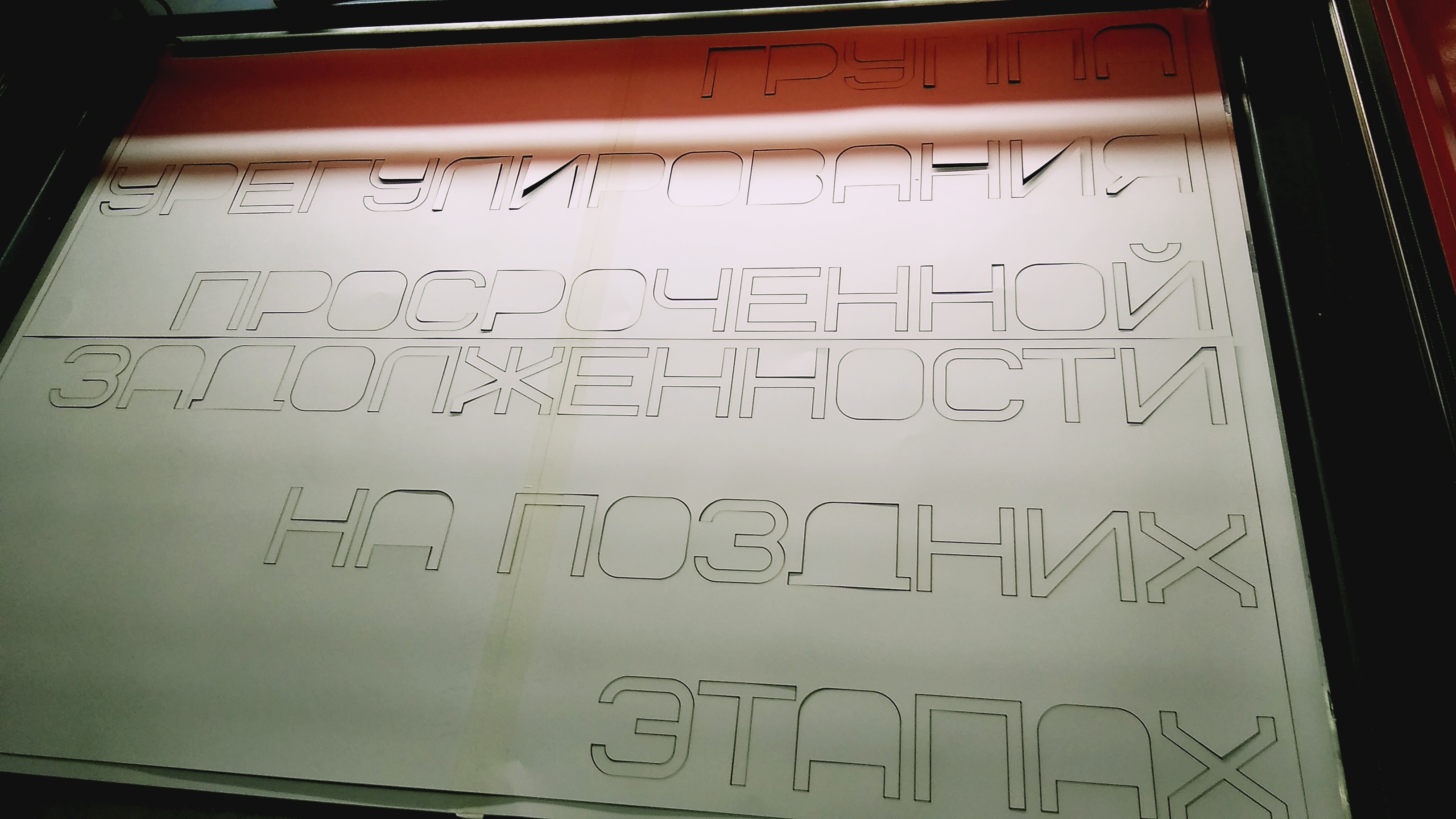 Следующим этапом мы вырезали на лазерном станке сами надписи из оргстекла “Опал” толщиной 5 мм. с уже заранее приклеенным двусторонним скотчем. А так же был изготовлен трафарет для удобного наклеивания надписи целиком. Трафарет вырезали из ватмана.